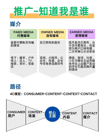 3. 推广:要实现“知道我是谁”,借助付费、自有、获得媒体,依4C模型,围绕核心主题,结合用户、场景、内容、媒介开展,吸引用户关注。