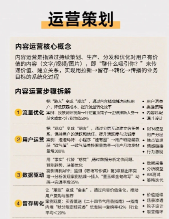3. 运营策划:推进流量优化(用内容触达用户、降获客成本)、用户运营(分层互动、提活跃度忠诚度)、数据驱动(靠数据分析优化决策)、留存转化(促用户复购推荐)。