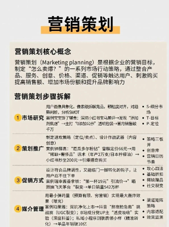 2. 营销策划:开展市场研究(具象用户画像、拆解竞品)、策划推广(制定策略、设计创意)、促销方式(设计转化钩子、用折扣赠品等)、媒介管理(用有限预算实现最大曝光、监测效果)。