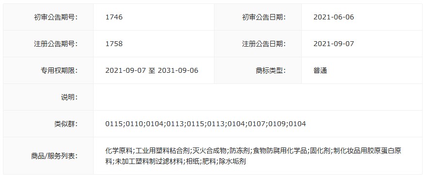 商品服务:化学原料;工业用塑料粘合剂;灭火合成物;防冻剂;食物防腐用化学品;固化剂;制化妆品用胶原蛋白原料;未加工塑料制过滤材料;相纸;肥料;除水垢剂